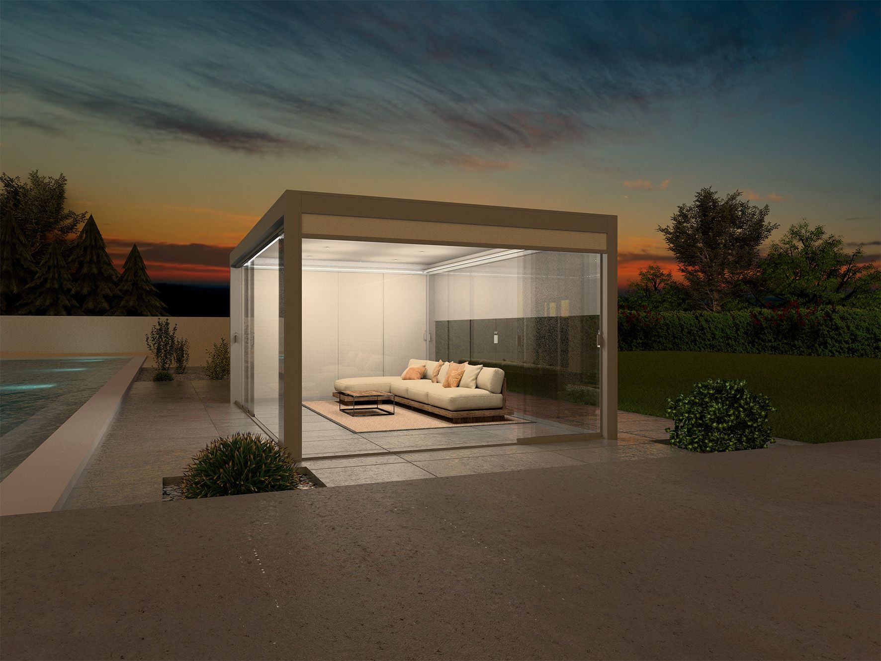 - Individuell & modular erweiterbar: Optional sind Glas-Schiebe- oder Festelemente, Senkrechtmarkisen, LED-Beleuchtungen, Heizstrahler etc. – so nutzen Sie Ihren Outdoor-Bereich wetterunabhängig.